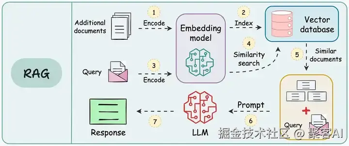 - 生成响应:将检索结果与查询拼接 → 输入LLM生成最终答案