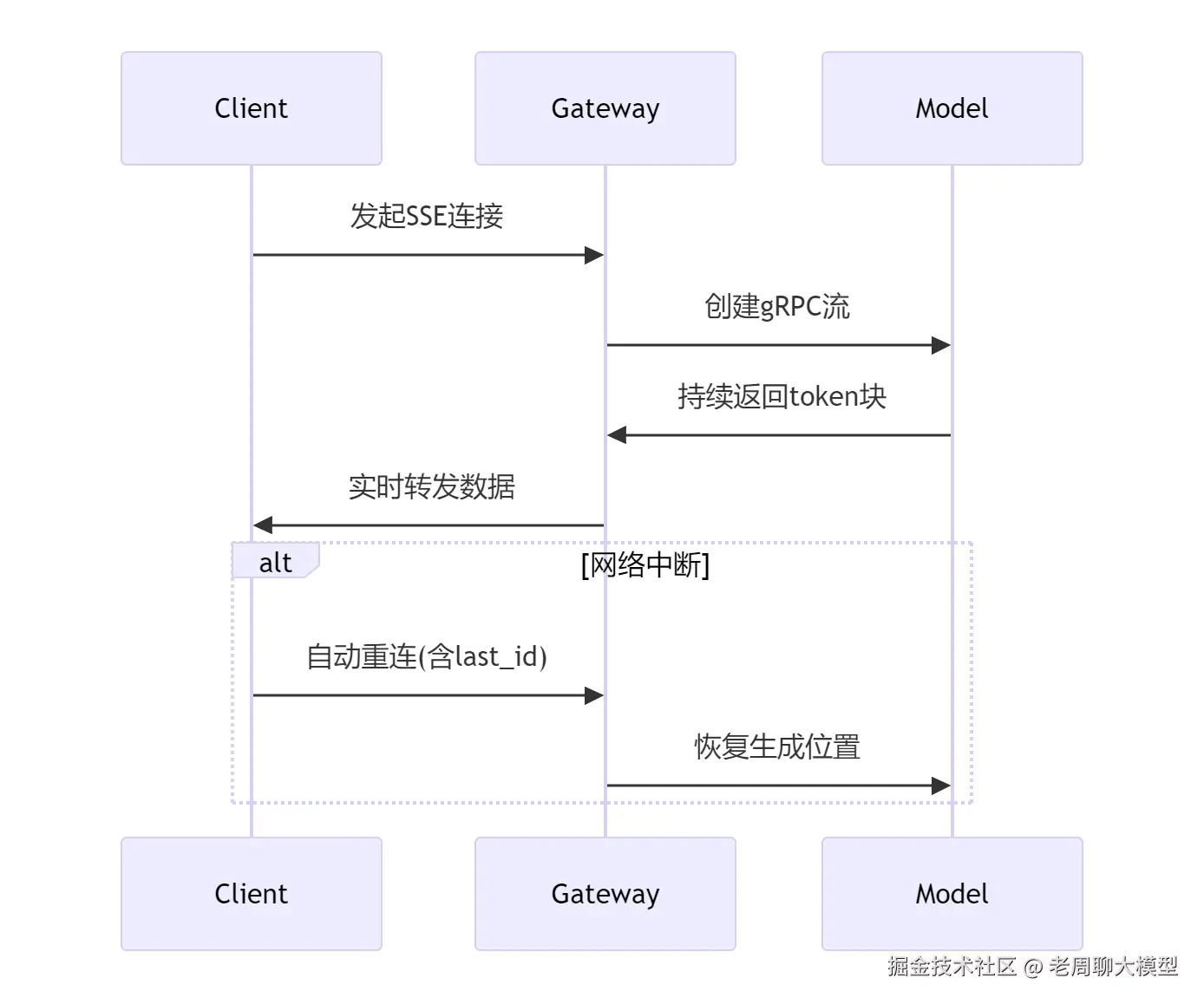 Model->>Gateway: 持续返回token块