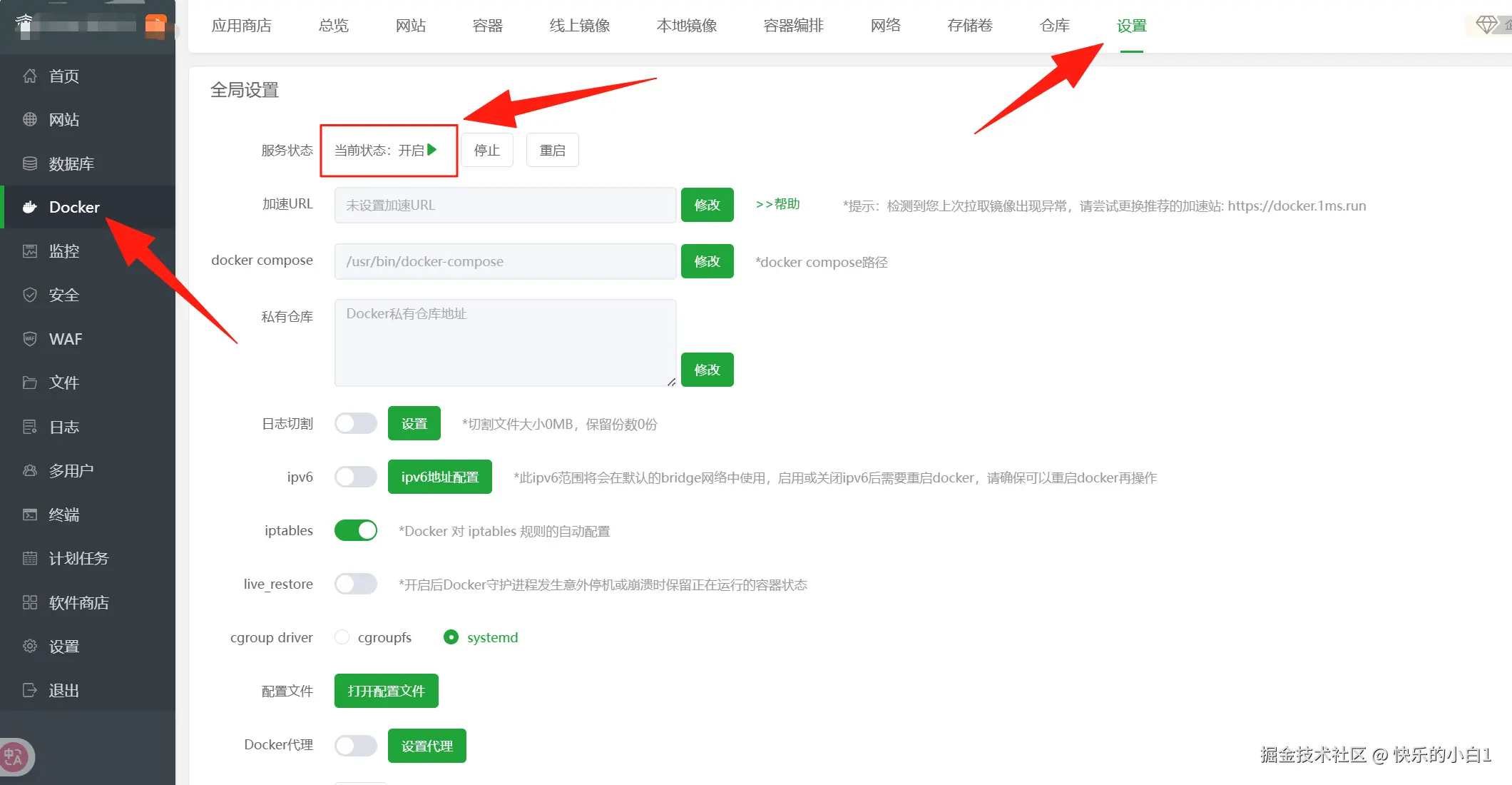 2.在左边找到docker,然后根据提示安装docker,安装完成后在设置里查看运行状态开启!