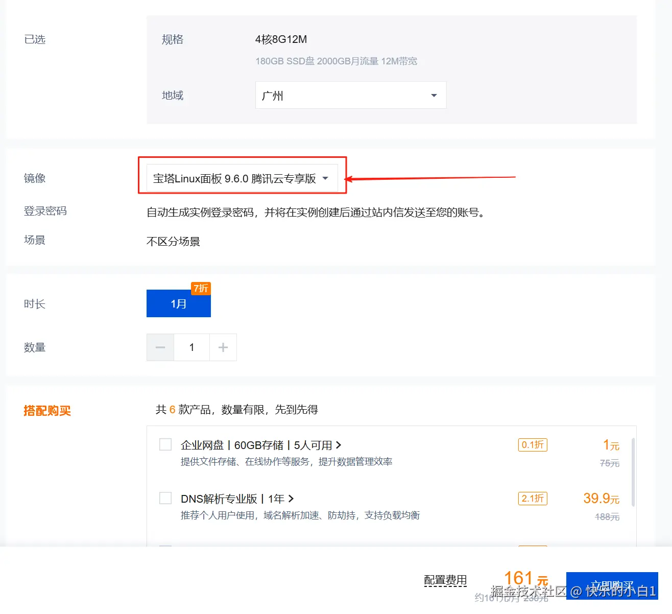 2.挑选到合适服务器后,点击立即购买,在安装时直接选宝塔面板安装就行,简单高效!这里给轻量团队点赞!直接一步到位。