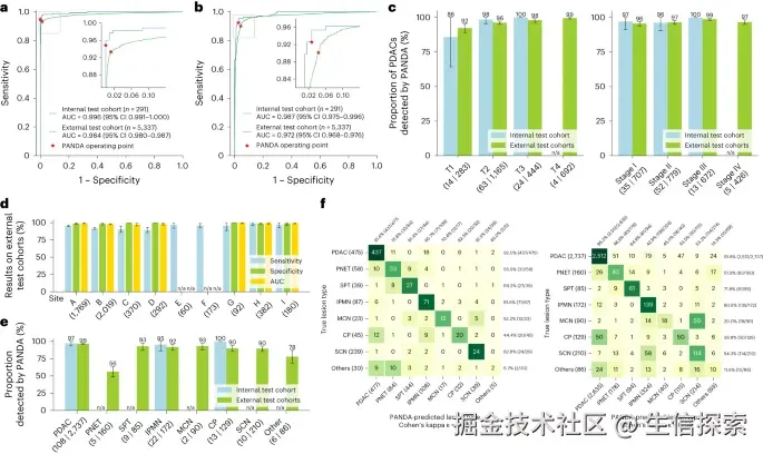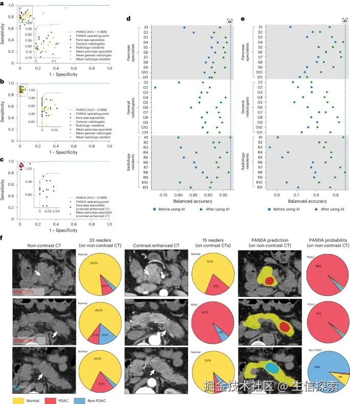 - abc图(AI vs 医生):33 名医生(含专家、普通放射科医生、住院医师)的 ROC 曲线均在 PANDA 下方。PANDA 识别胰腺癌的灵敏度比医生平均高 34.1%,特异性高 6.3%;住院医师单独诊断时灵敏度甚至低至 16.7%-35.2%。