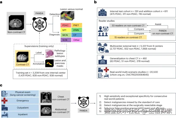 - de中图(AI 辅助前后):医生结合 PANDA 后,病灶检测灵敏度提升 8.5%,胰腺癌识别灵敏度提升 20.5%,住院医师性能接近专家水平。