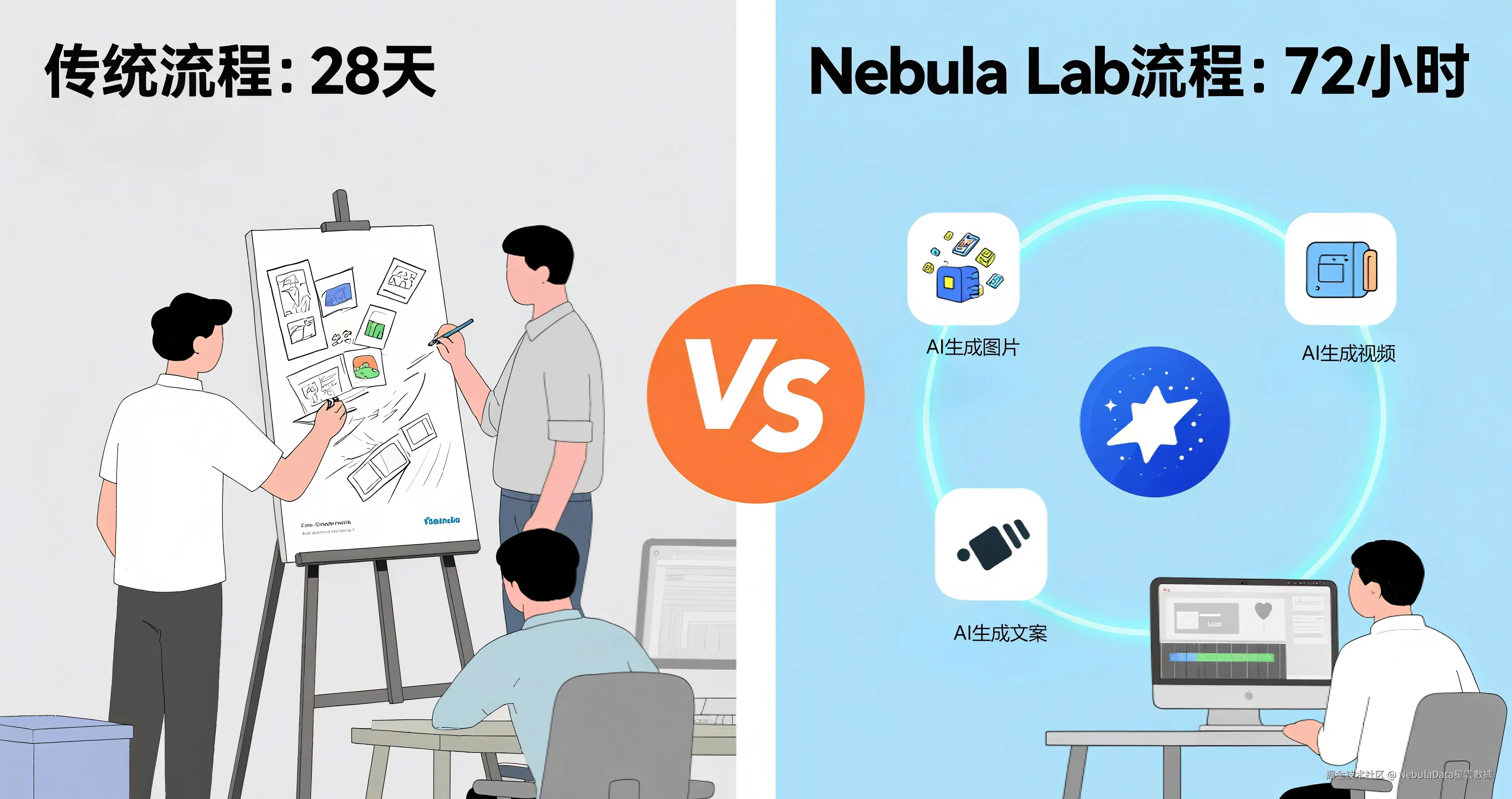 接入 Nebula Lab 后,他们通过 AI 批量生成基础素材,用万物迁移功能更换场景元素,再经混剪工具组合成短视频,72 小时便完成了全部创作。