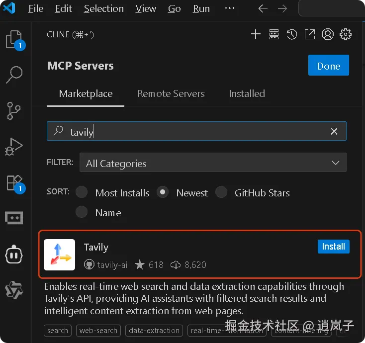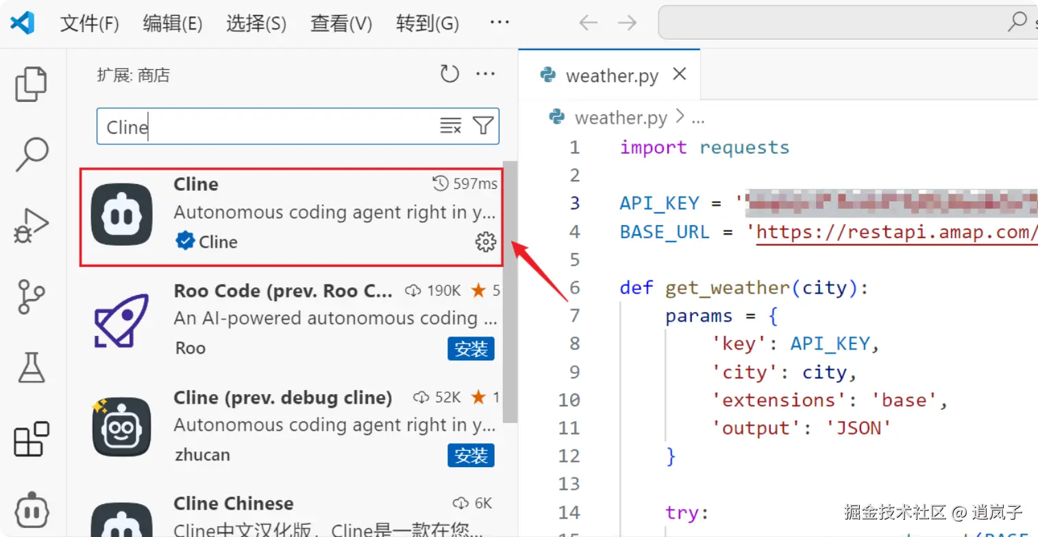 Cline是VSCode的一个插件,在安装VSCode的基础上,在插件市场安装Cline即可。