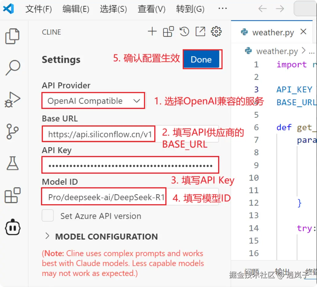 设置使用的大模型:点击右上角的齿轮配置API信息举例1:如下是使用硅基流动的平台: