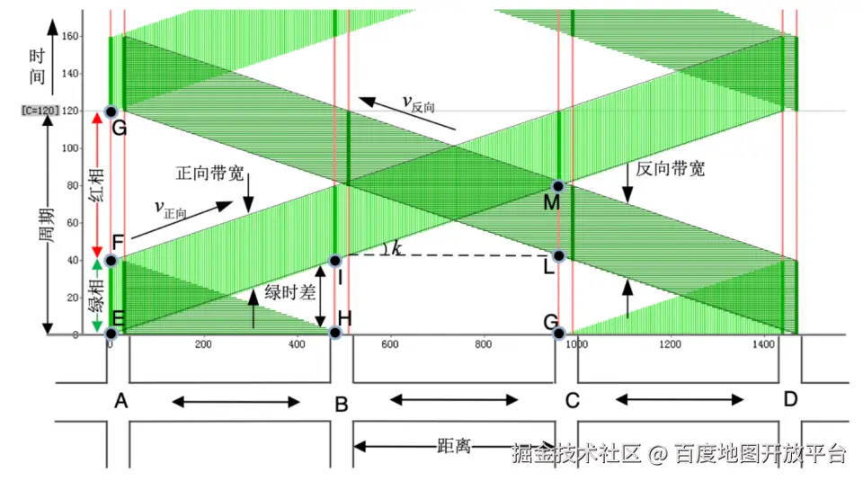 多路口同时挖掘:在部分区域和路段,不同路口之间也会有绿波协调关系,通过挖掘路口和路口之间的相位差等关系,可校验不同路口之间配时方案的精准程度,由点到面进一步提升城市交通整体的挖掘实时性和合理性。同时挖掘路口间相位差等可提升用户绿波的覆盖率和准确率产品体验。