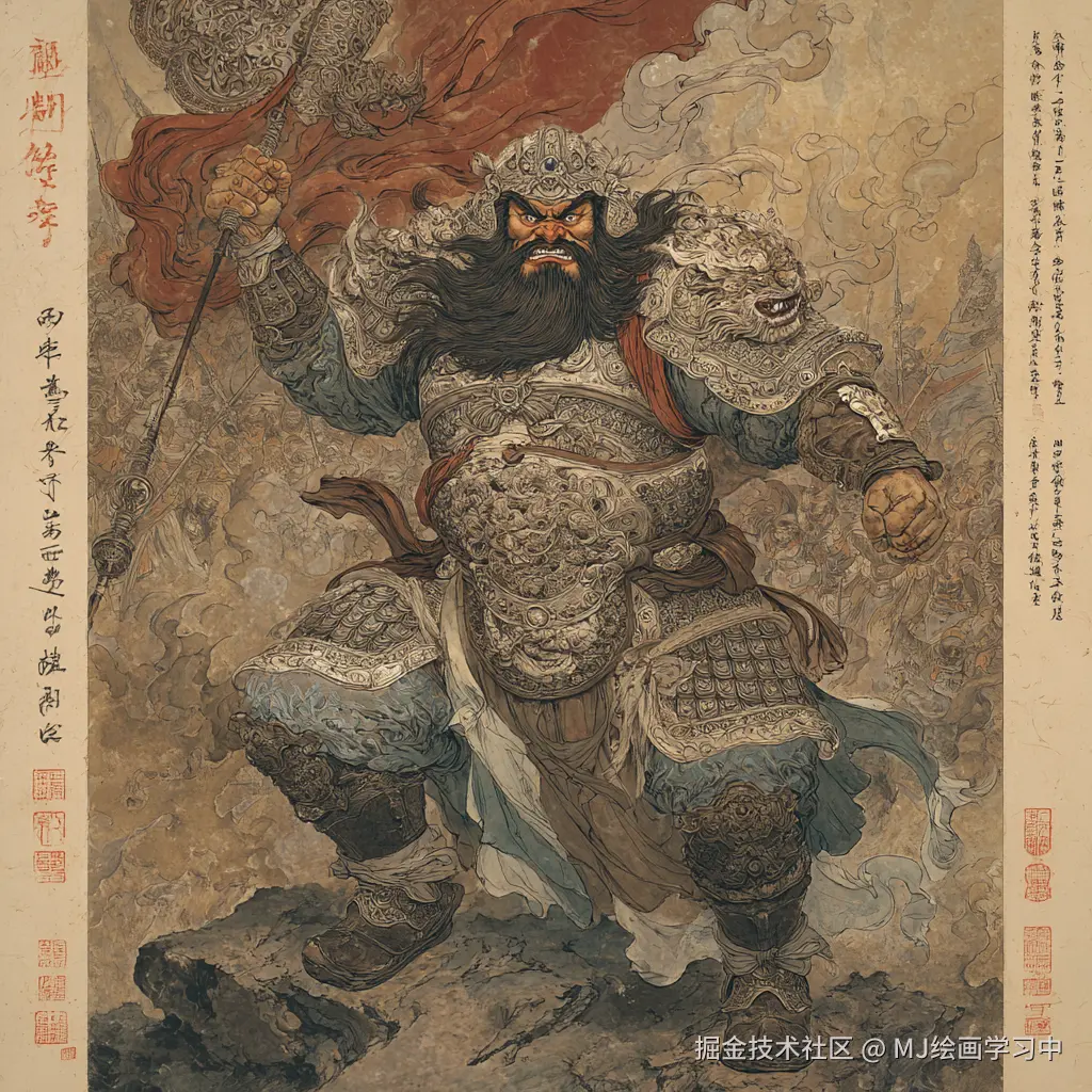 中年猛将程咬金,全身甲胄像,唐初光要甲制式:身披皮质镶铁札甲,外罩半臂锦袍,兽头抱肚腰带,铁制环项护颈,肩覆虎头吞膊。虬髯戟张怒目圆睁,左手提马槊槊锋染血,右手持竹节钢鞭,跨黄骠马踏敌旗而立。背景为虎牢关战场硝烟,落日熔金光照,泼墨写实风格,肌肉贲张动态,敦煌壁画赭石色调 --ar 3:4 --style raw --v 6.0