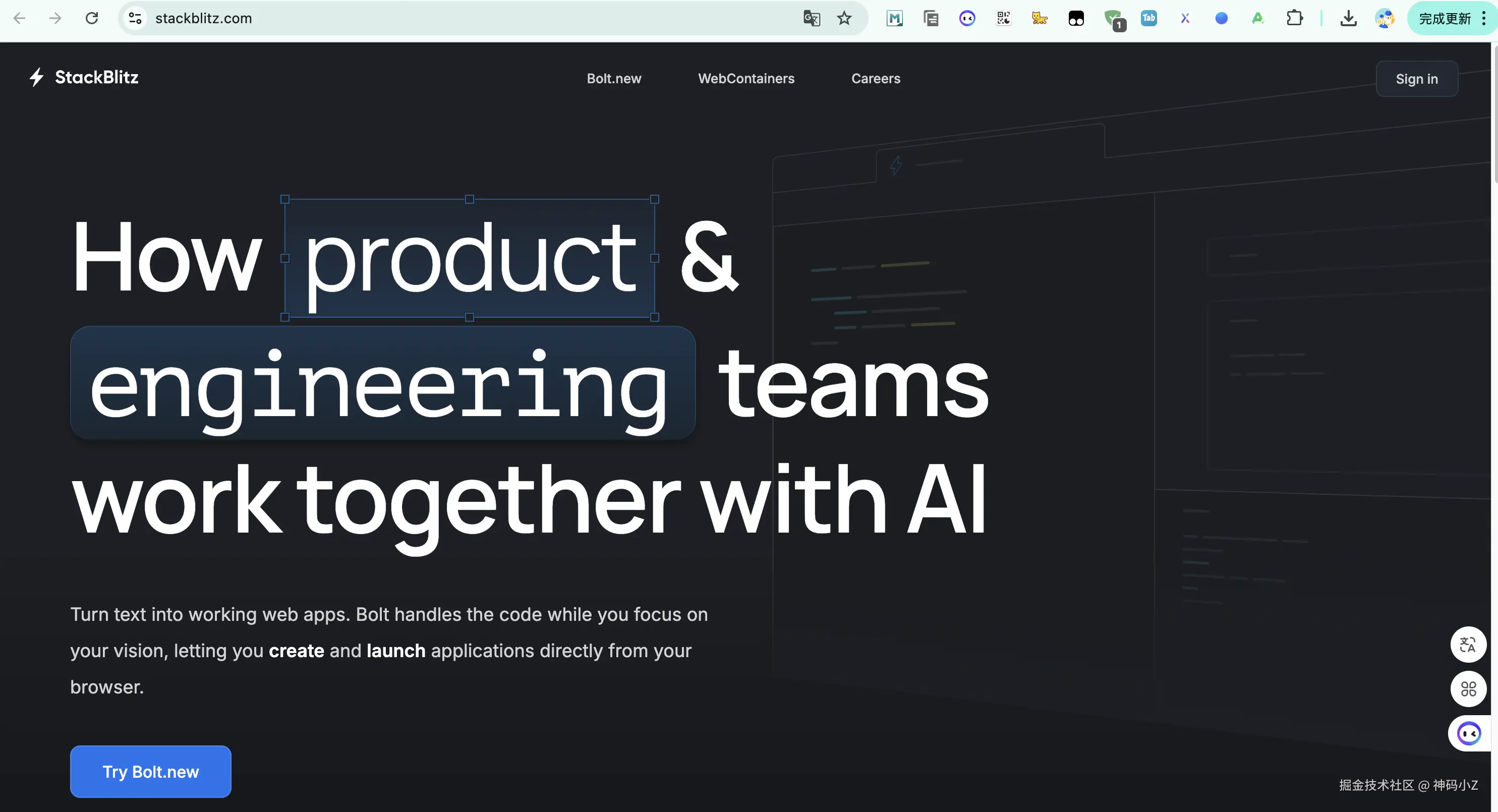 StackBlitz让开发者能在浏览器里直接构建Web应用,不需要本地环境。这个想法很棒,特别是对于想快速验证想法的开发者。