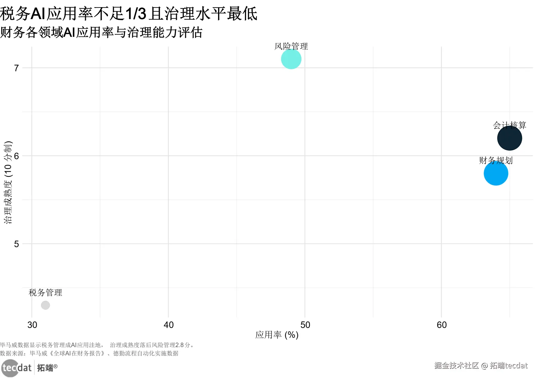 毕马威的全球数据勾勒出AI在财务领域的渗透图景:71%的企业已应用AI,会计核算、财务规划的应用率超60%。但气泡图暴露了隐患——税务管理应用率仅31%,治理成熟度低至4.3分(满分10分),比风险管理低近3分。