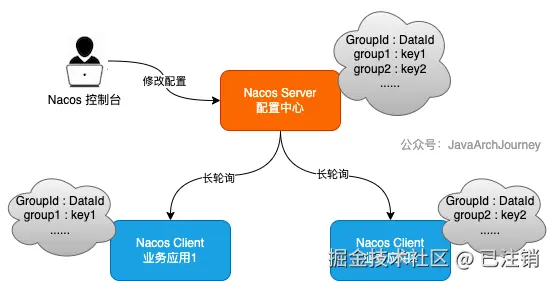 dataId和group下的配置变化。 - 配置变更通知:Nacos 1.x 中,Nacos Client 通过“