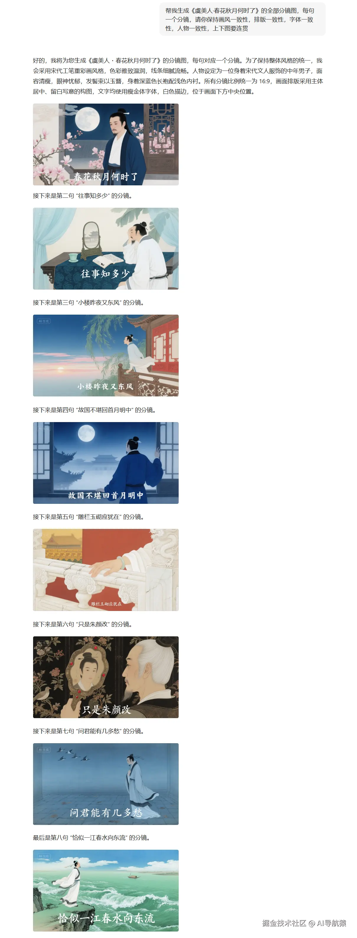 帮我生成《虞美人·春花秋月何时了》的全部分镜图,每句一个分镜,请你保持画风一致性,排版一致性,字体一致性,人物一致性,上下图要连贯