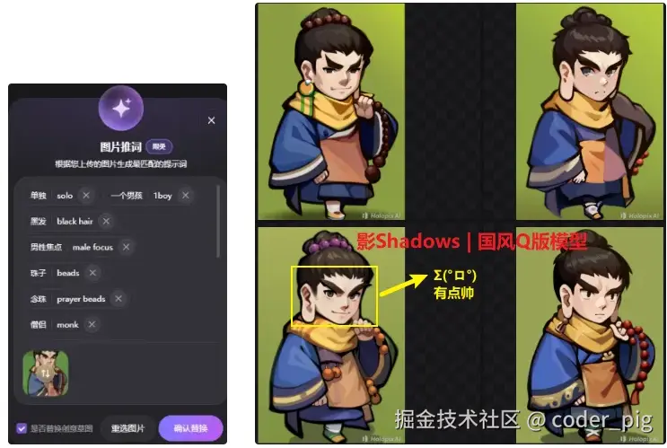 🤷♀️ 原图太糊,导致很多细节识别不出来 (大耳朵、佛珠等),不过生成的人物还是帅,哈哈哈🤣
