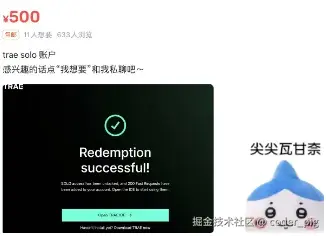 😶 两周前 (7.21) Trae-国际版 正式发布「SOLO」模式,需要 Pro 账户,邀请码一度 "难求",海鲜市场还有人挂出 500块的 "天价",这都能炒?我是无法理解的🤷♀️,目前一个月的成品号 60+ 。