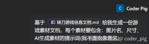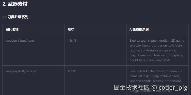 😄 接着就是写提示词 微(da)调(mo) 、feature(BUG) 完善 和 游戏素材生成替换,依旧使用 Holopix AI 来生成我们的 游戏素材,出图的 速度 和 质量 都比较稳定,提供了不同风格的 预设模型 (也可自己训练) 保证了出图的 "风格一致性",而且价格相比mj也是 "量大管饱" (256*256,一张约0.026元)。然后写下提示词,让AI根据文档生成一份 "素材文档,连提示词都不用自己想,文件名也有了,等下还方便替换,偷懒到了极致🤣~
