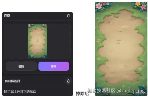 选择 "擦除",负向描述词加下限制,不要出现泥土外的其它东西,然后再次生成图片: