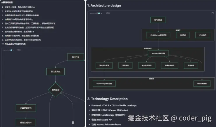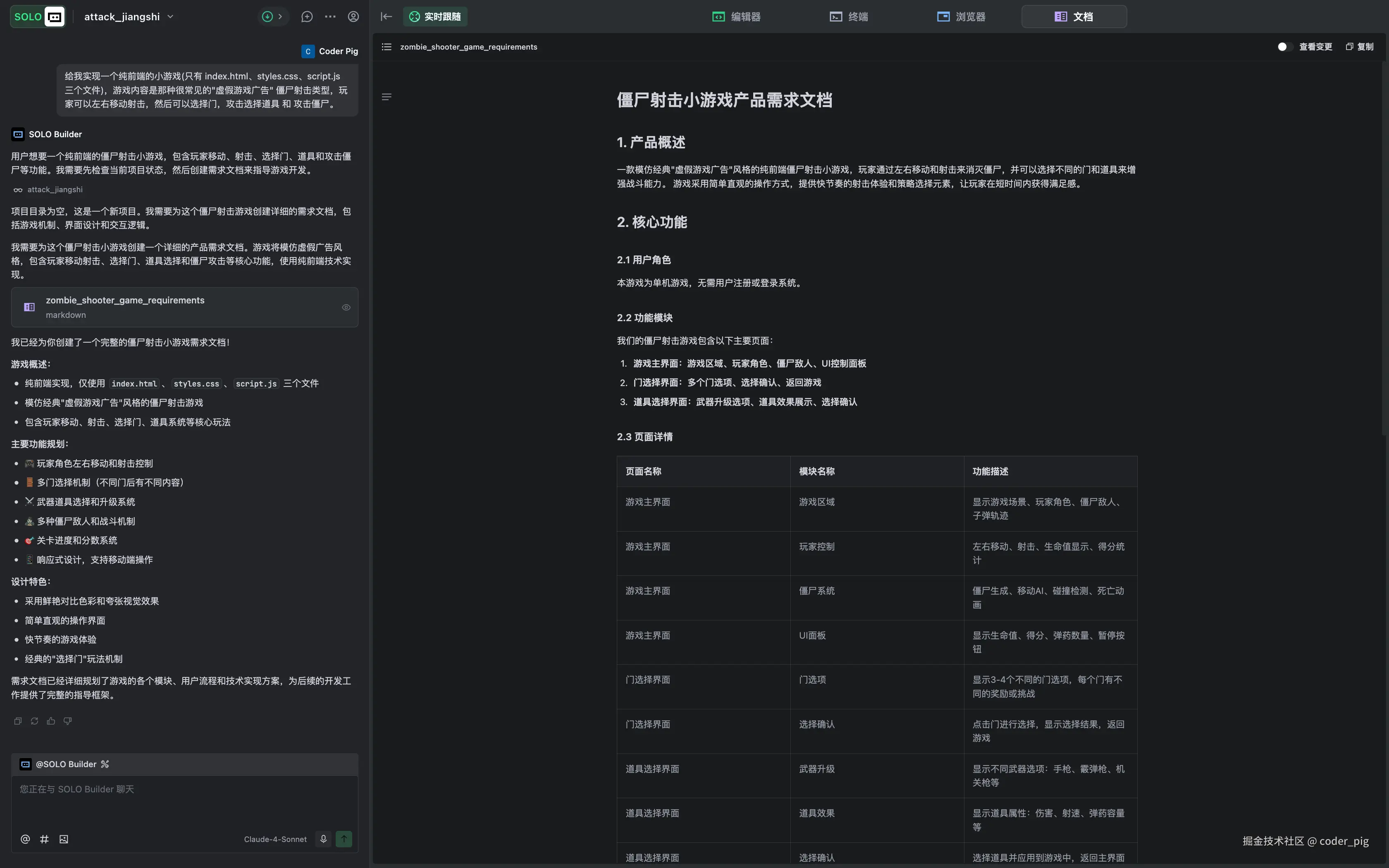 写 Prompt (提示词) 简要描述下游戏玩法,回车后,Trae 哐呲哐呲给我写了 两份文档: