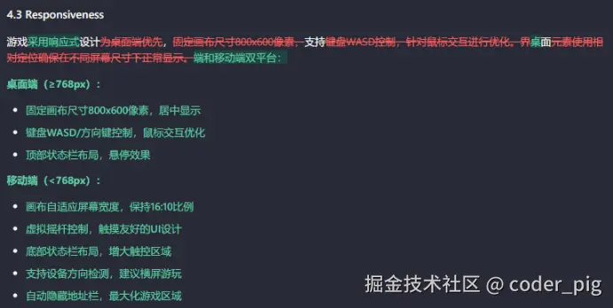 接着可以手动编辑文档,也可以用 自然语言 描述,让 Trae 代劳,如:我希望兼容 移动端,可以看到文档变更: