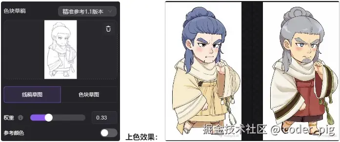 线稿自动上色的话:「一键成稿 → 图片推词」,记得把 "灰度"、"单色"、"线稿" 等类似的提示词删掉,不然生成的图片只会是黑白的。还有,得选中「线稿草图」,可以按需调整下参考原图的「权重」