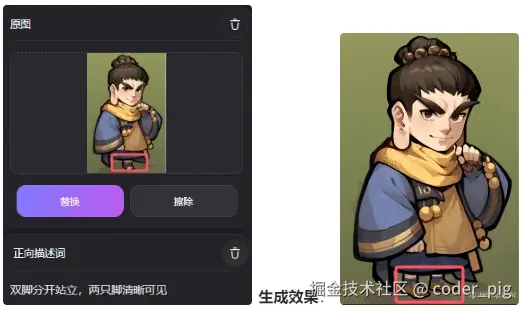 接着需要做下细节调整,生成另外两张图片:走路-双脚 + 被攻击-吃痛的脸部表情,小范围微调用「局部细化」,大范围改动用「涂抹替换」,这里用后者,涂抹下脚部分的区域,简单写下正向描述词: