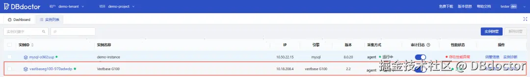 通性检测通过后,点击提交后即可成功纳管Vastbase G100数据库。在实例列表界面,可以看到已纳管的Vastbase G100实例信息。此时,性能洞察已开启,开始体验DBdoctor的强大吧!
