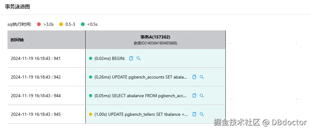 查看各异常事件右侧的"查看详情"按钮,可以查看异常产生的详细过程,如图是锁等待事件产生的过程。事务A等待事件长达1.425秒。