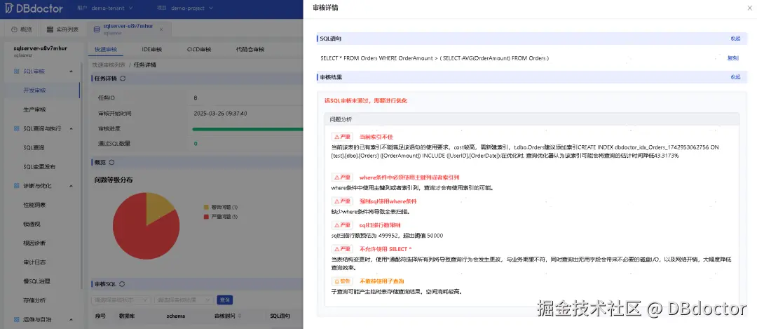 5.SQL审核全生命周期管理SQL审核提供对SQL从开发到测试再到运维的全生命周期质量管理:1)开发审核:包含快速审核、IDE审核、CICD审核、代码仓审核,可以帮助开发人员从代码编写、代码提交等多个维度检查SQL的规范性,同时还可以提前评估出SQL在未来上线后的性能问题并推荐全局最优索引(该能力目前是数据库行业独有能力)。2)生产审核:包含慢SQL审核、库表元数据审核,可以帮助运维人员快速发现问题SQL并能发起工单进行跟踪处理,可有效提升生产系统的稳定性。