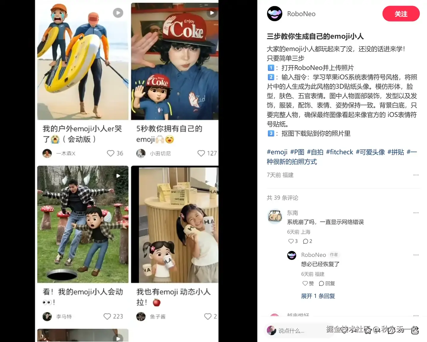 不过,这次的热潮也不全靠UGC引爆。【RoboNeo】早早便在小红书上注册了账号,并于7月14日发布了自己的第一篇笔记;也是在#emoji小人 词条刚开始有点讨论苗头的时候,【RoboNeo】发布了自己的官方指令教程。虽然第一篇教程笔记难以溯源,但笔者猜测能让#emoji小人 词条火到如今地步,或多或少都是有点官方助推的意思了(但官方笔记的流量属实惨淡,心疼一秒)。