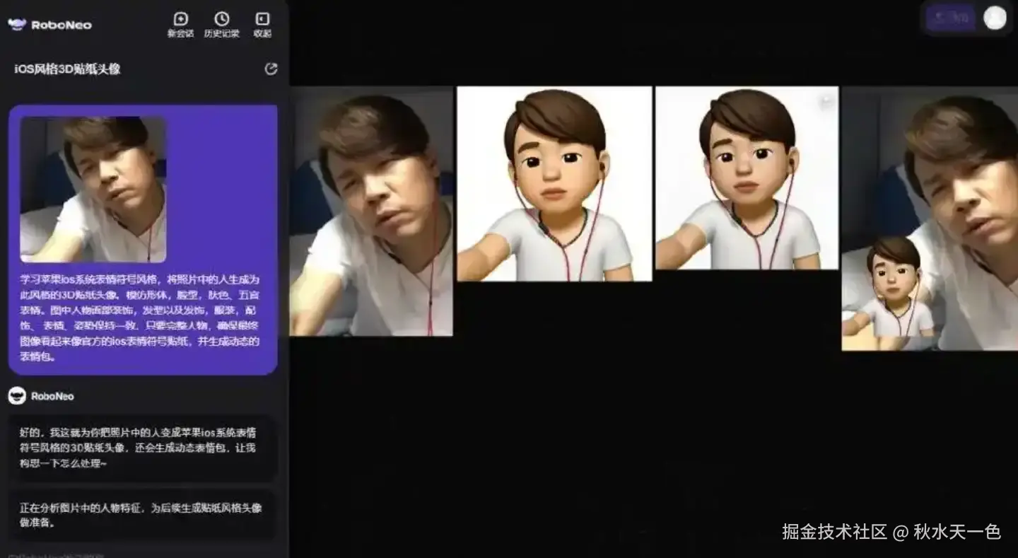 就笔者观察到的大部分笔记来看,该emoji动态小人主要出自于美图公司的AI助手【RoboNeo】,只需要输入下面的设计指令,就可以在大概1分钟以内生成iOS风格的贴纸头像,再经过进一步的动态表情包请求,便可以生成用户所需的live动图了。