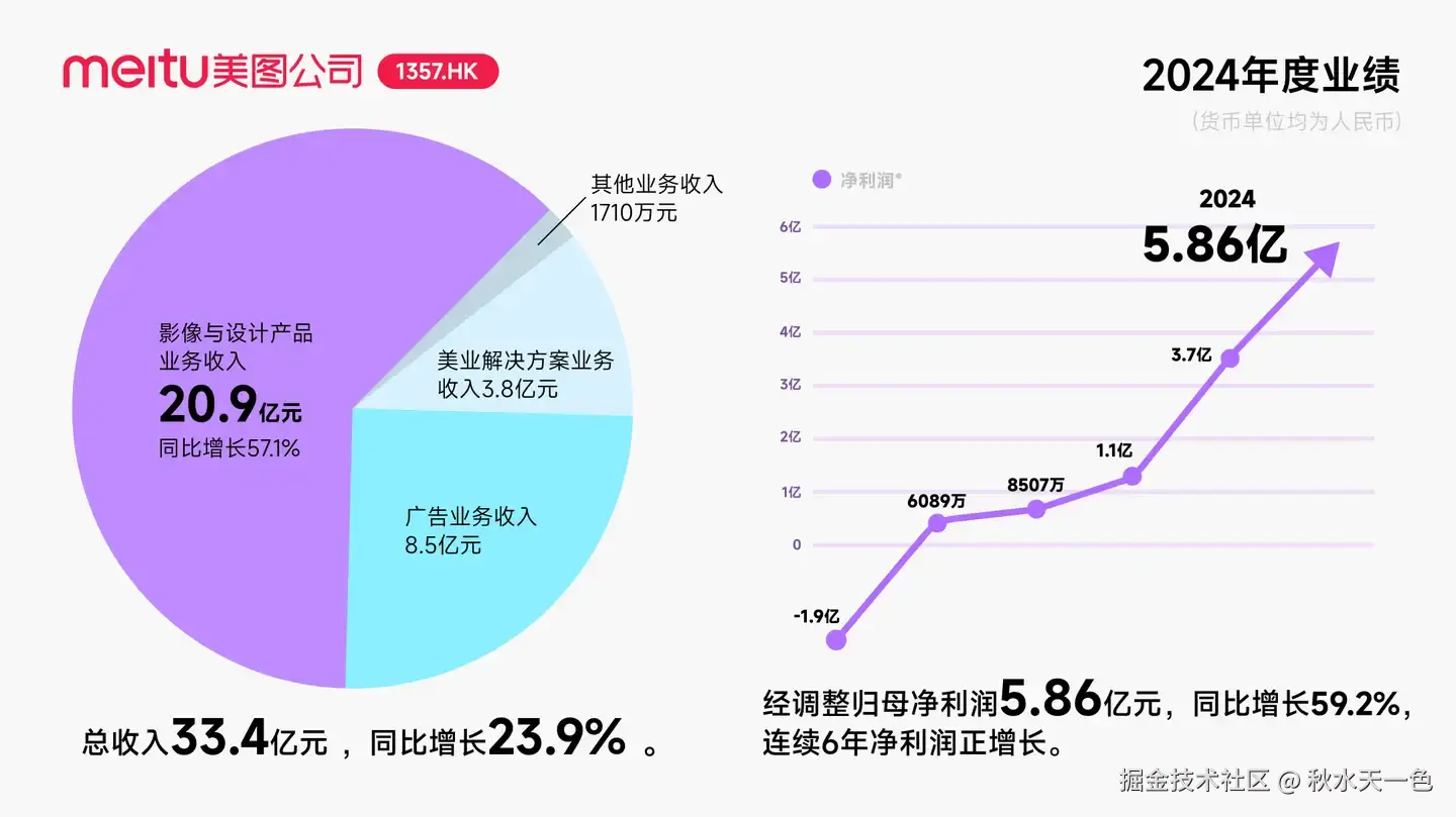 据美图公司2024财报显示,其2024年总收入33.4亿元,同比增长23.9%。经调整后归属于母公司权益持有人净利润5.86亿元,同比增长59.2%。美图公司首席财务官兼公司秘书颜劲良表示,“在AI技术的驱动下,我们在影像与设计产品赛道的规模化投入取得了令人振奋的回报。不仅看到全球付费订阅用户数快速增长,月活跃用户规模也持续扩大。收入结构的优化让毛利率持续增加,进而带动净利润创下历史新高。”