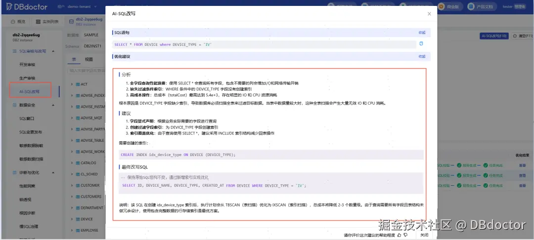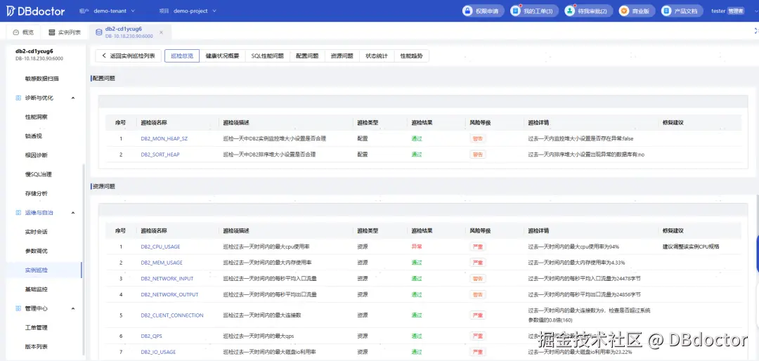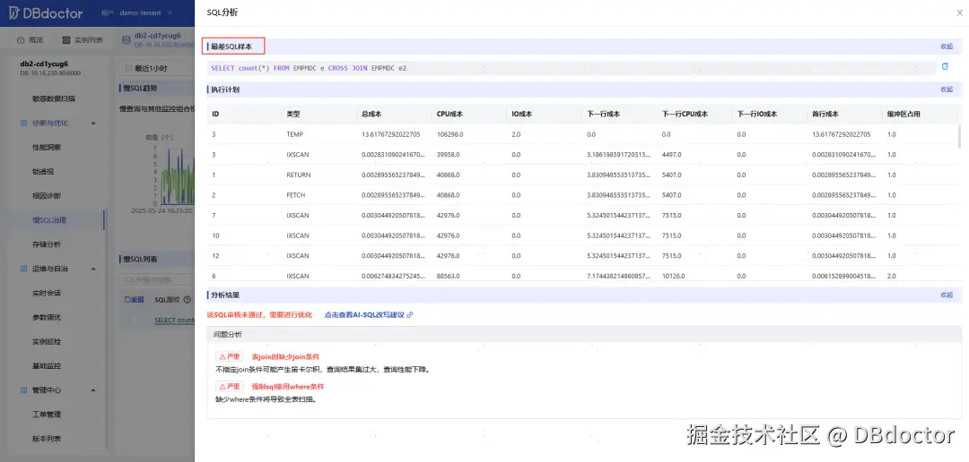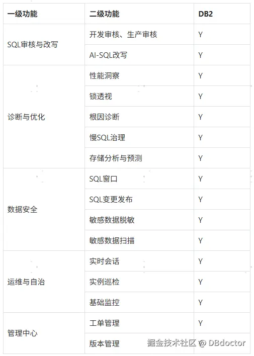当前DBdoctor 适配DB2 10.5及以上版本,并提供SQL审核、AI-SQL改写、性能洞察、根因诊断、实例巡检、基础监控、存储分析、数据安全等功能服务。