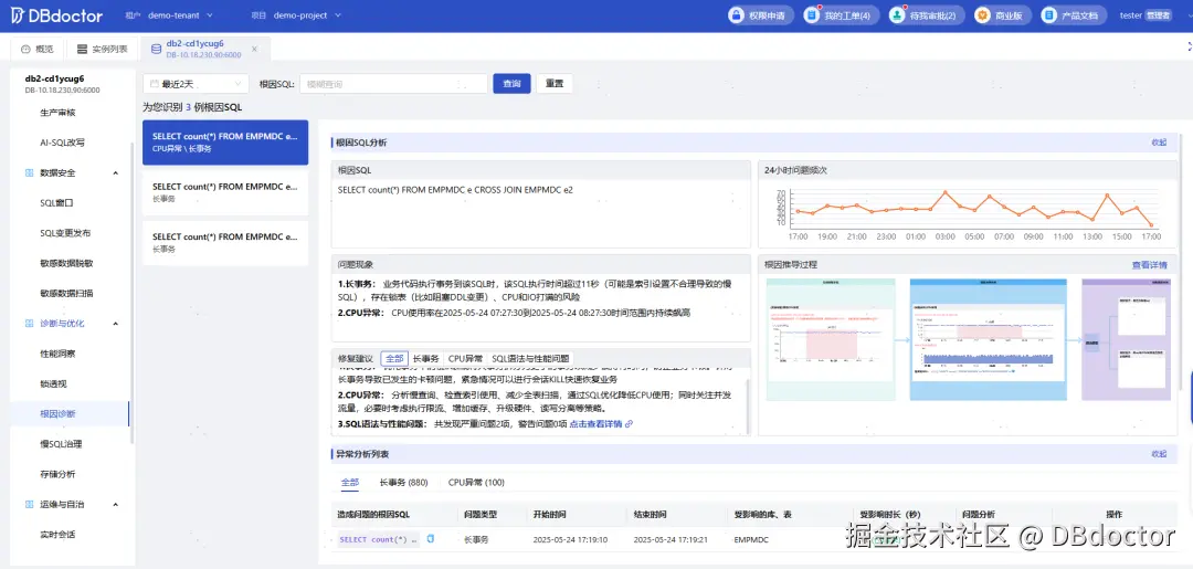 根因诊断直接展示该实例在选定时间段内存在的问题根因SQL指纹,并会详细描述该SQL导致的问题现象,同时可以记录该SQL指纹在数据库里造成的每一次异常。