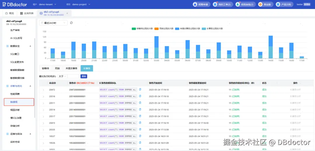 涵盖锁等待、死锁、长事务、未提交事务四大锁场景。慢动作回放问题现场,直观展示事务SQL的锁形成过程,快速找到问题源头。