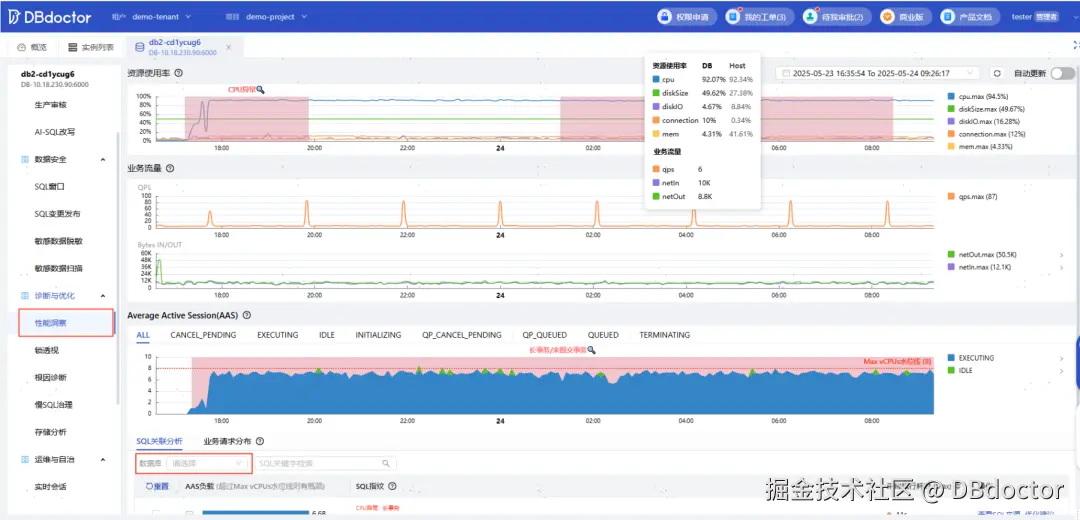 通过数学模型精准定位,打破基于经验、规则、阈值诊断的传统,真正实现单条SQL资源量化,把资源消耗映射为颜色面积,直观定位数据库性能问题并给出优化建议(比如索引推荐)。包含资源使用率、业务流量、Average Active Session(AAS即平均活跃会话)曲线,同屏展示三者的关联关系,三步即可快速定位性能问题。