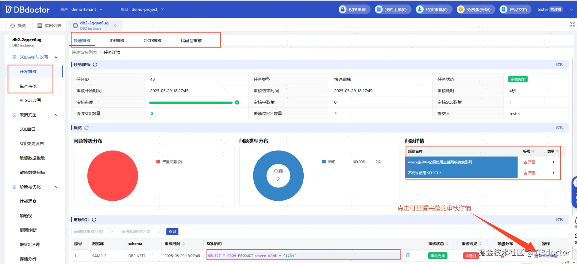 1)开发审核:包含快速审核、IDE审核、CICD审核、代码仓审核,可以帮助开发人员从代码编写、代码提交等多个维度检查SQL的规范性,实现SQL全流程管理。