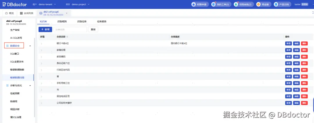 数据安全提供了在线查询SQL的能力和支持DDL、DMLd的变更。为保护敏感数据,DBdoctor推出的数据安全功能矩阵,以“智能发现 + 动态防护 + 立体审核”为核心,为企业提供全生命周期的数据安全解决方案。
