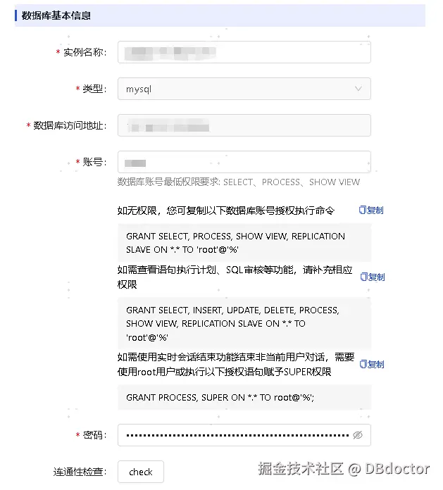 填写基本的数据库信息,实例名称、类型、数据库访问地址、账号、密码等等,最后点击连通性检查。