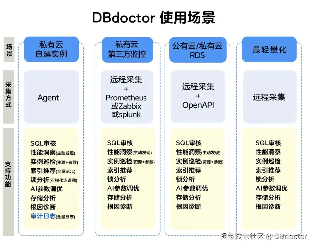 DBdoctor数据库监控解决方案,支持四大使用场景:私有云自建实例、私有云第三方监控、 公有云/私有云RDS、最轻量化,部署方式及支持功能详见下图。