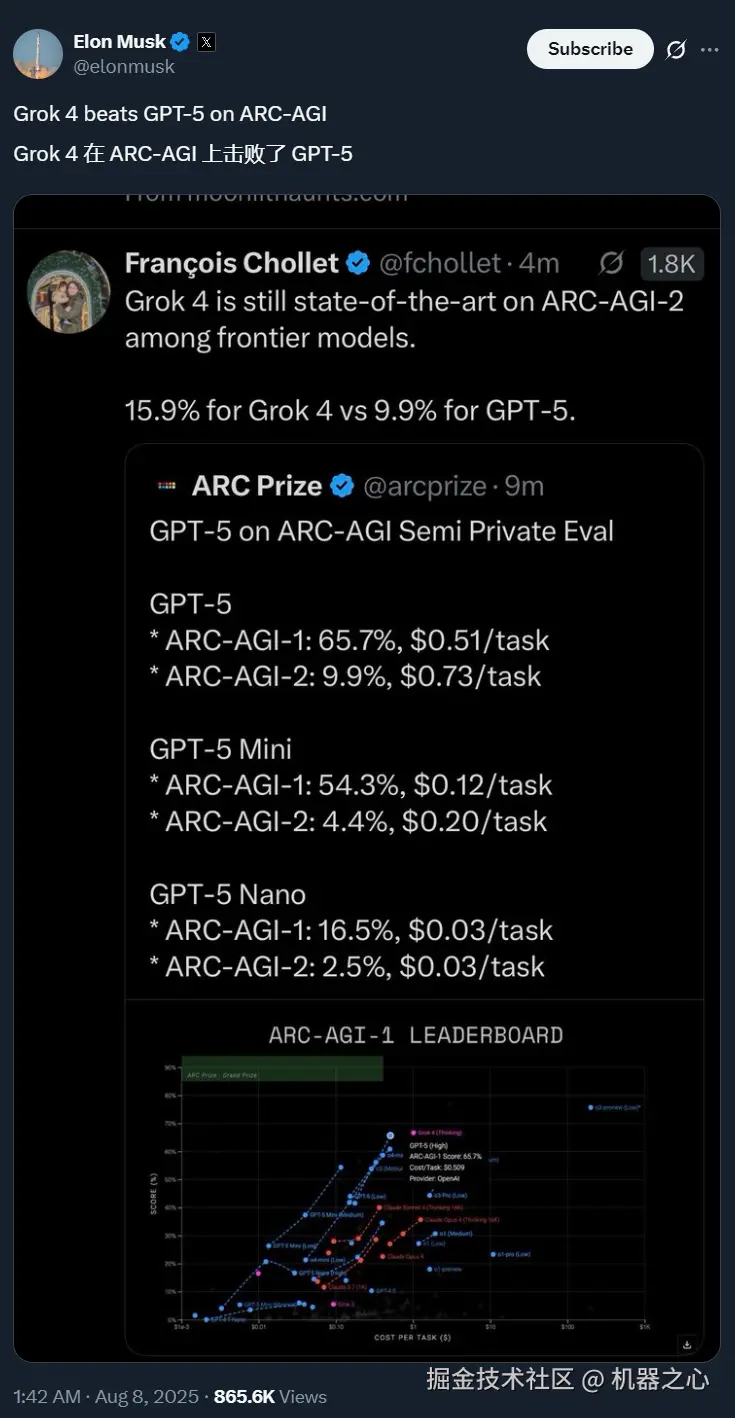 更尴尬的是,马斯克也跑来拆台,转发了 GPT-5 在 ARC-AGI-2 上没有打败 Grok 4 的消息: