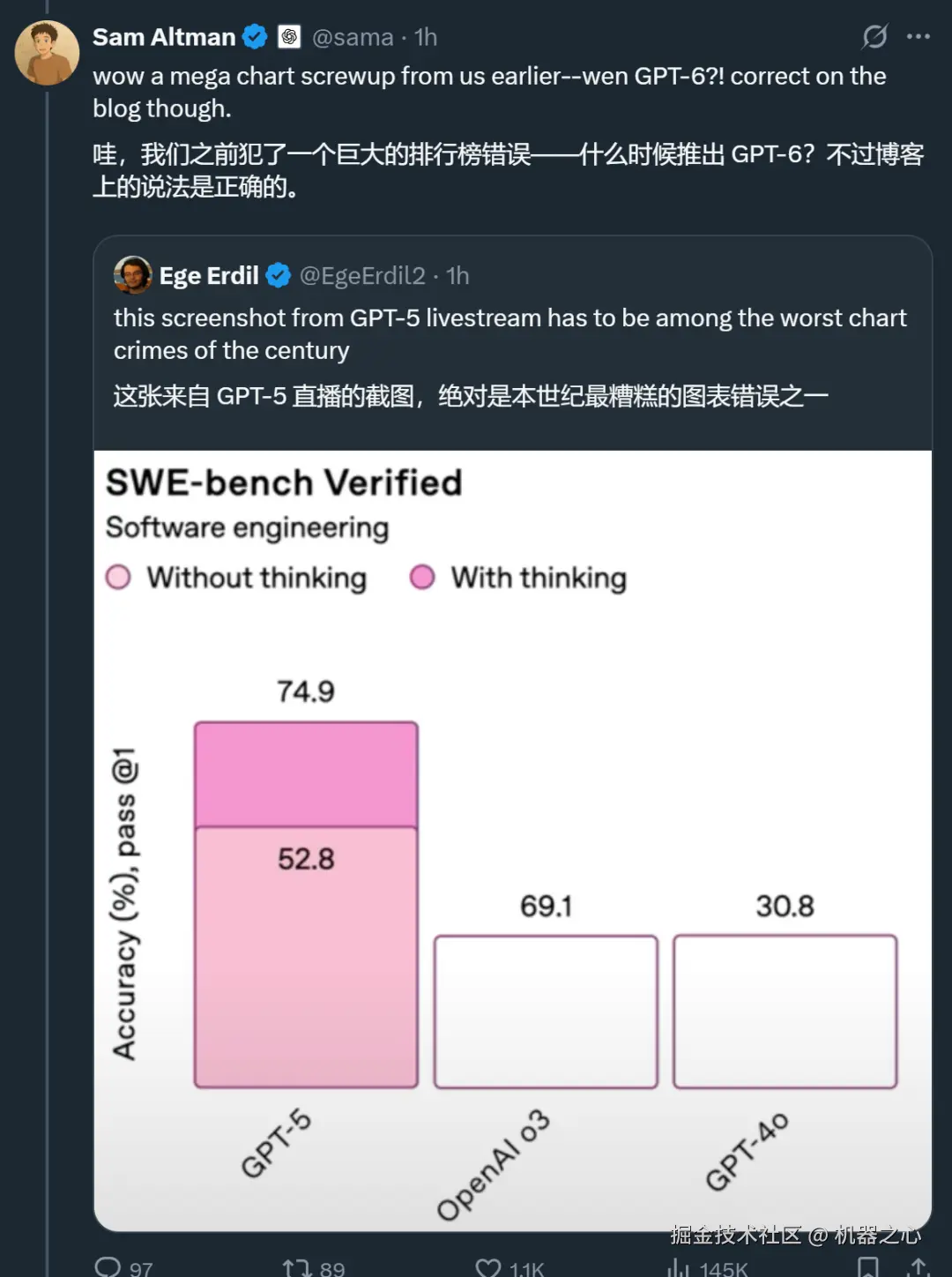 不过,现场也出了一些小 bug,比如做出的跑分图竟然是错的,奥特曼也承认了错误: