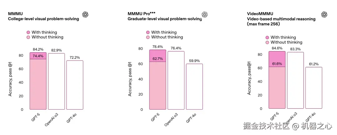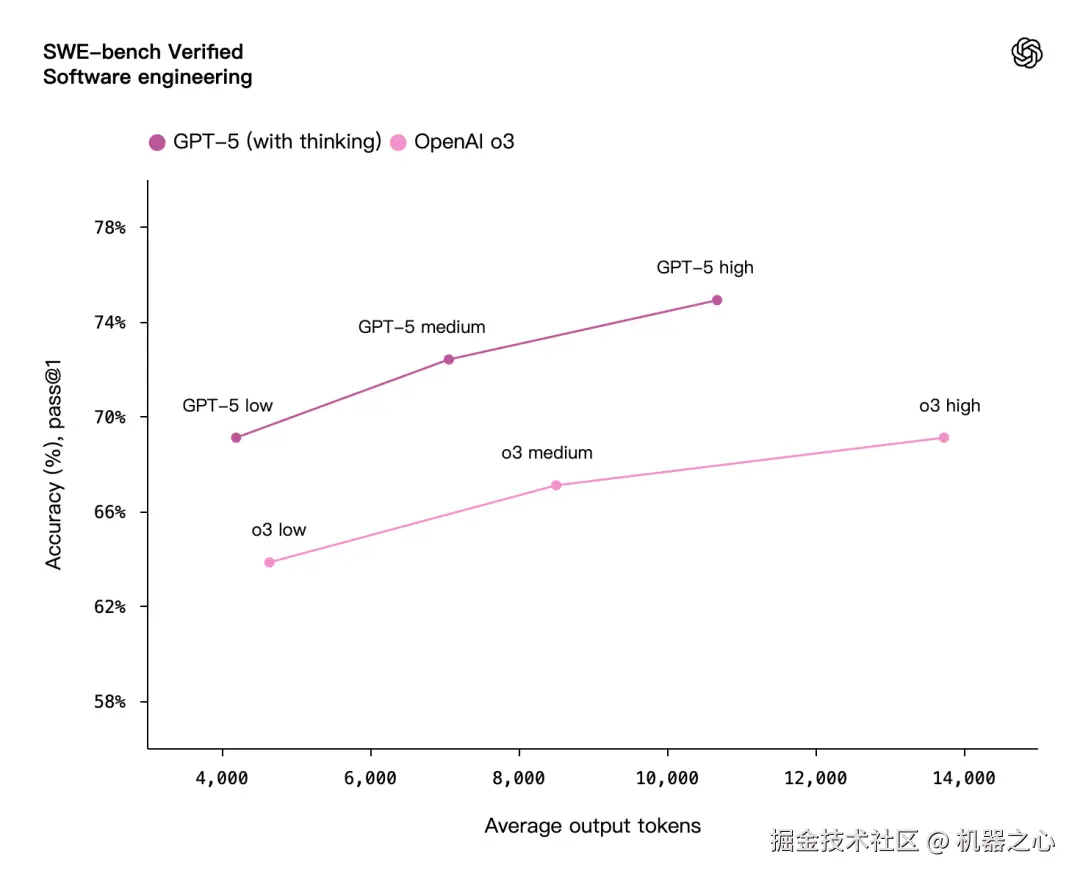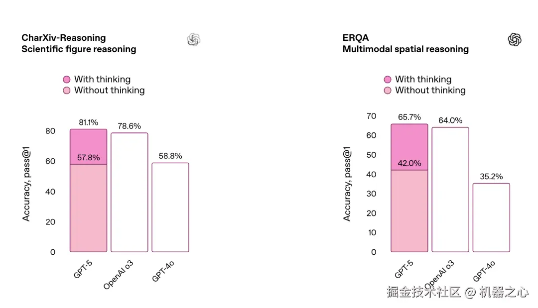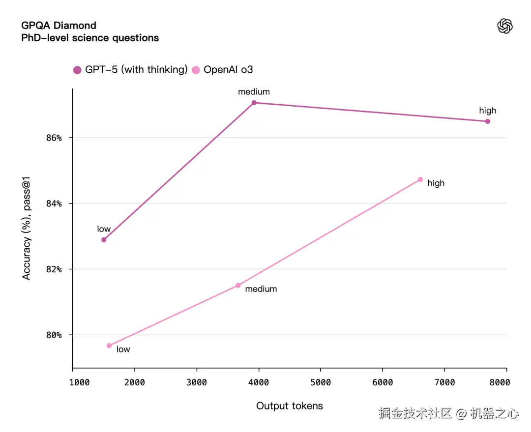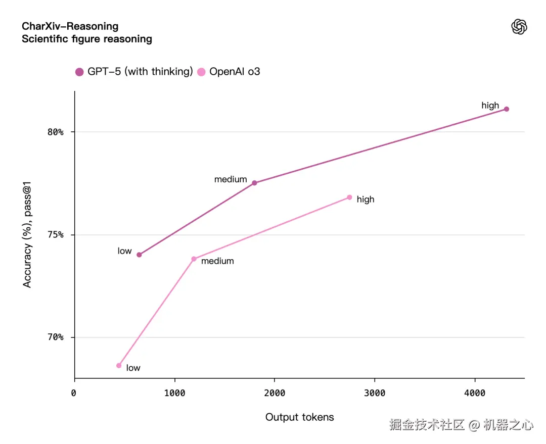 GPT‑5 能以更少的思考时间创造更大价值。评估数据显示,在视觉推理、智能体编程和研究生级科学问题解决等场景中,启用思考功能的 GPT‑5 性能表现优于 OpenAI o3 模型,同时输出 token 量减少 50-80%。
