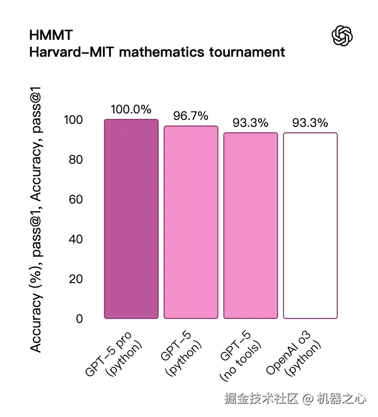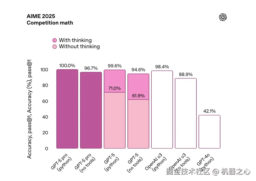 不应将使用工具的 AIME 结果与不使用工具的模型的性能直接进行比较;这是 GPT-5 如何有效利用可用工具的一个例子。