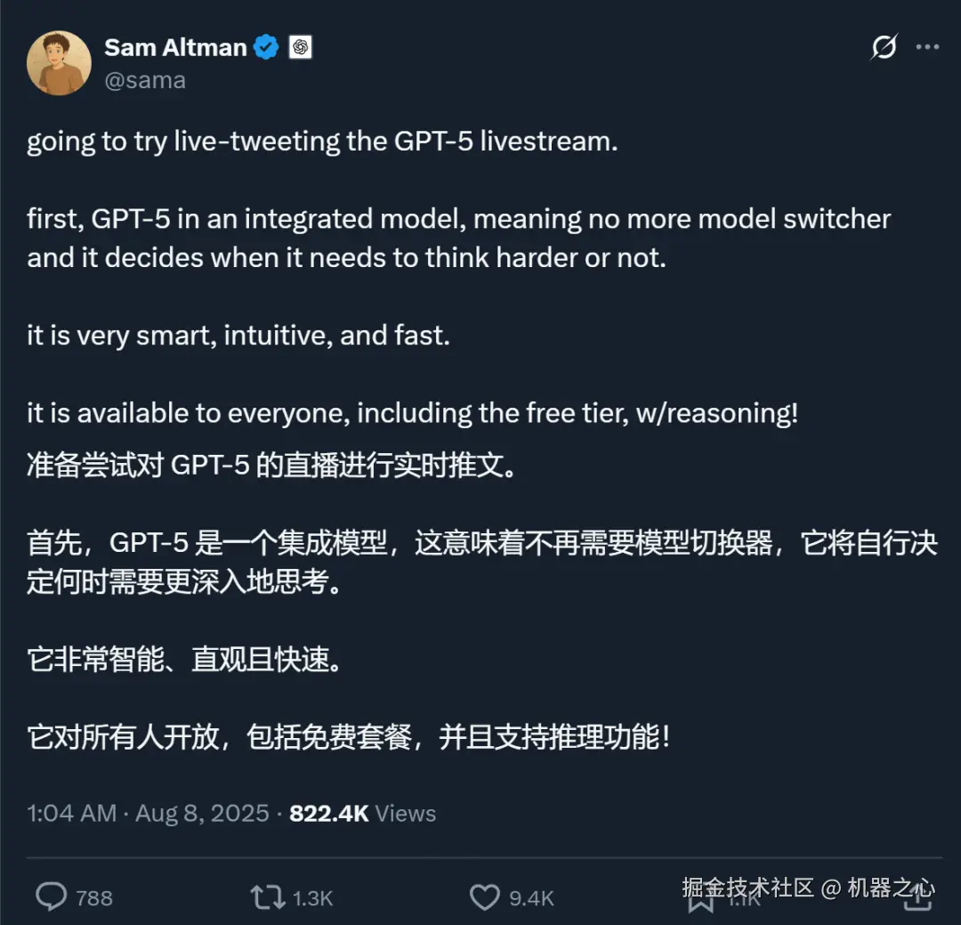 直播过程中,奥特曼也是连发十几条推特,介绍 GPT-5 的看点。