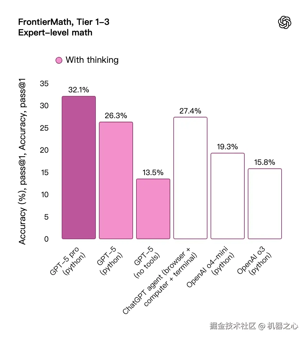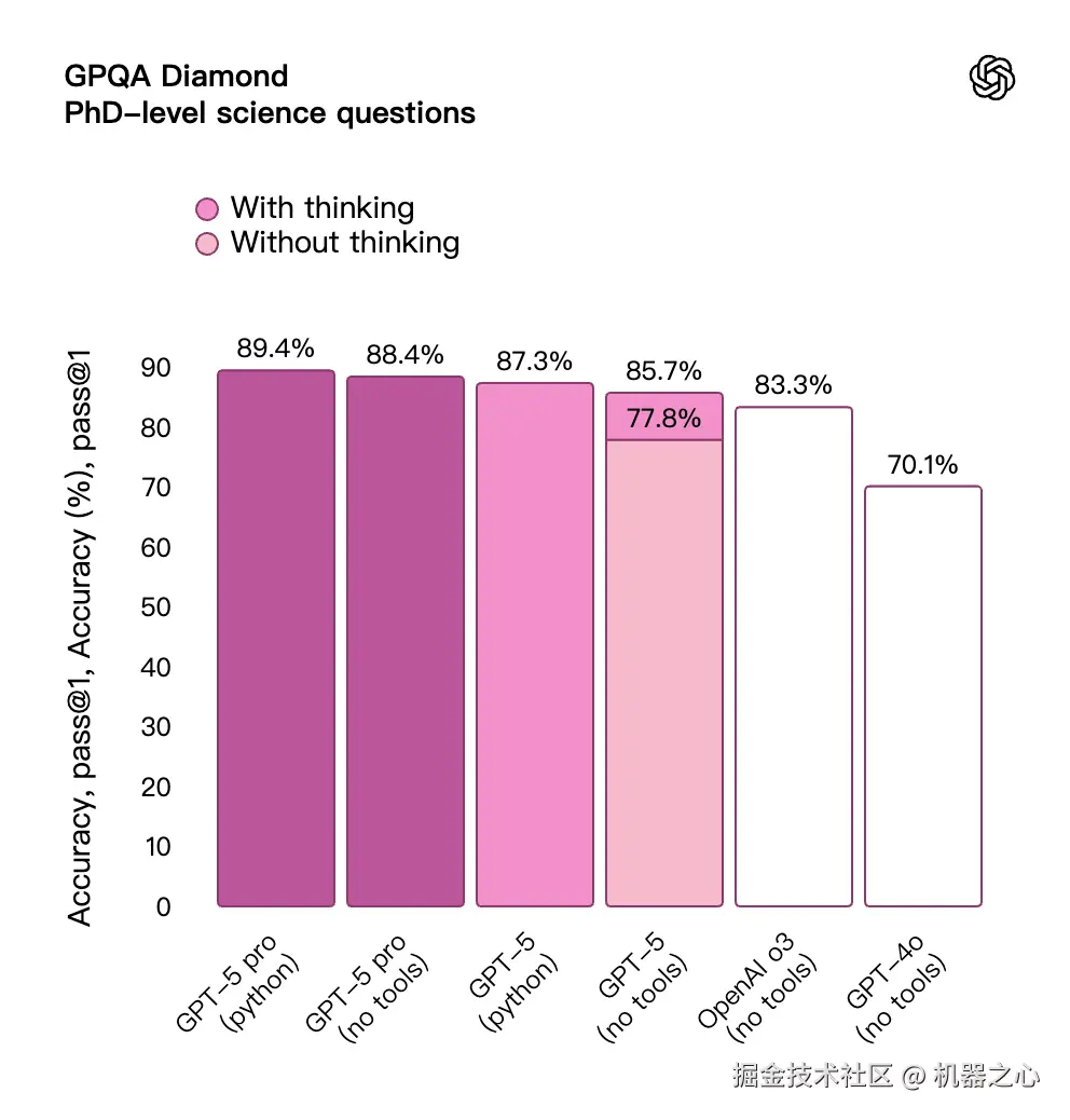 - 通过 GPT-5 pro 的扩展推理能力,该模型还在 GPQA 测试中创造了新的 SOTA,在无工具辅助的情况下得分 88.4%。