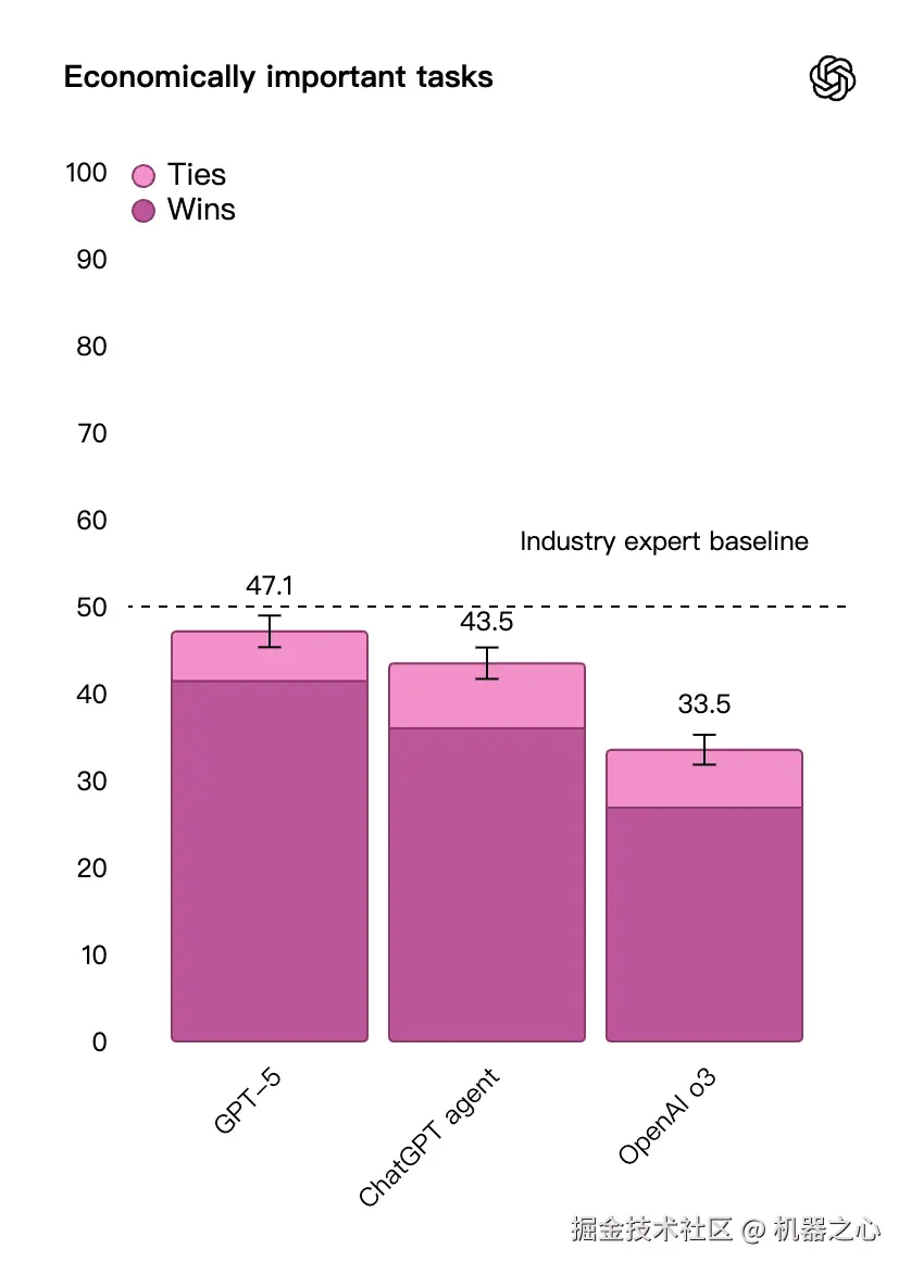 在 OpenAI 内部一个评估基准上,GPT5 同样表现卓越,该测试专门评估模型在复杂、经济价值知识型工作上的表现。在启用推理功能时,GPT‑5 在大约半数案例中的表现达到或超越人类专家水平,同时在法律、物流、销售、工程等 40 多个职业领域的综合任务表现上全面优于 o3 模型和 ChatGPT Agent。