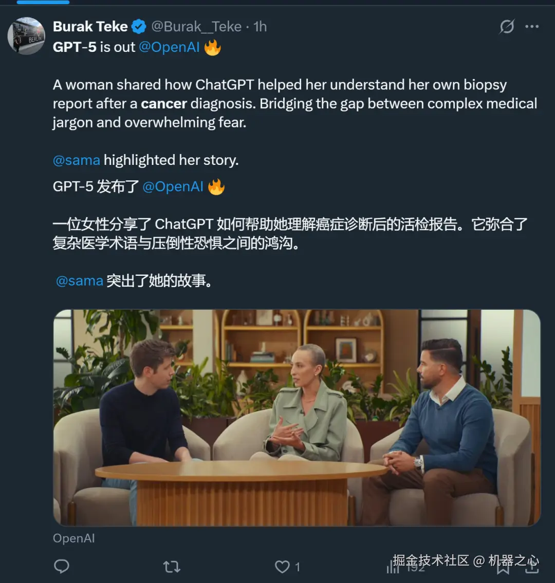 之前我们报道过的「AI 看病」功能,他们也做了专门的优化,还请了一位癌症患者现场分享自己的经历,以及 ChatGPT 在解释病情方面给予她的帮助。奥特曼表示,GPT-5 是迄今为止最好的健康模型。