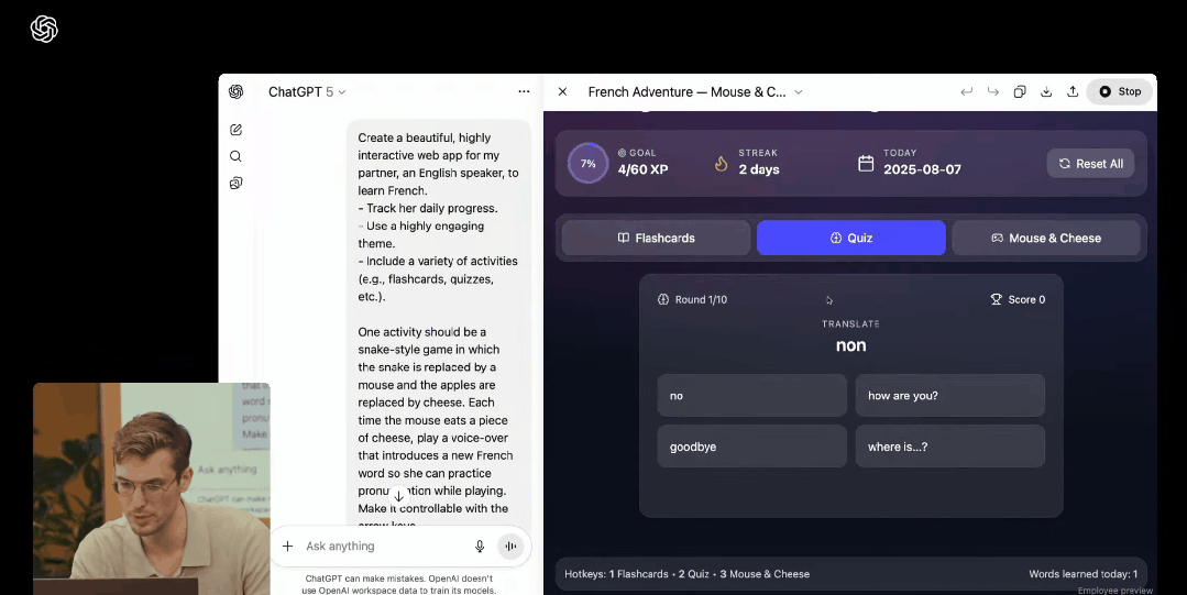 在编程方面,它可以用几分钟时间写出一个法语学习网页,帮你练发音,还能做题、玩游戏。