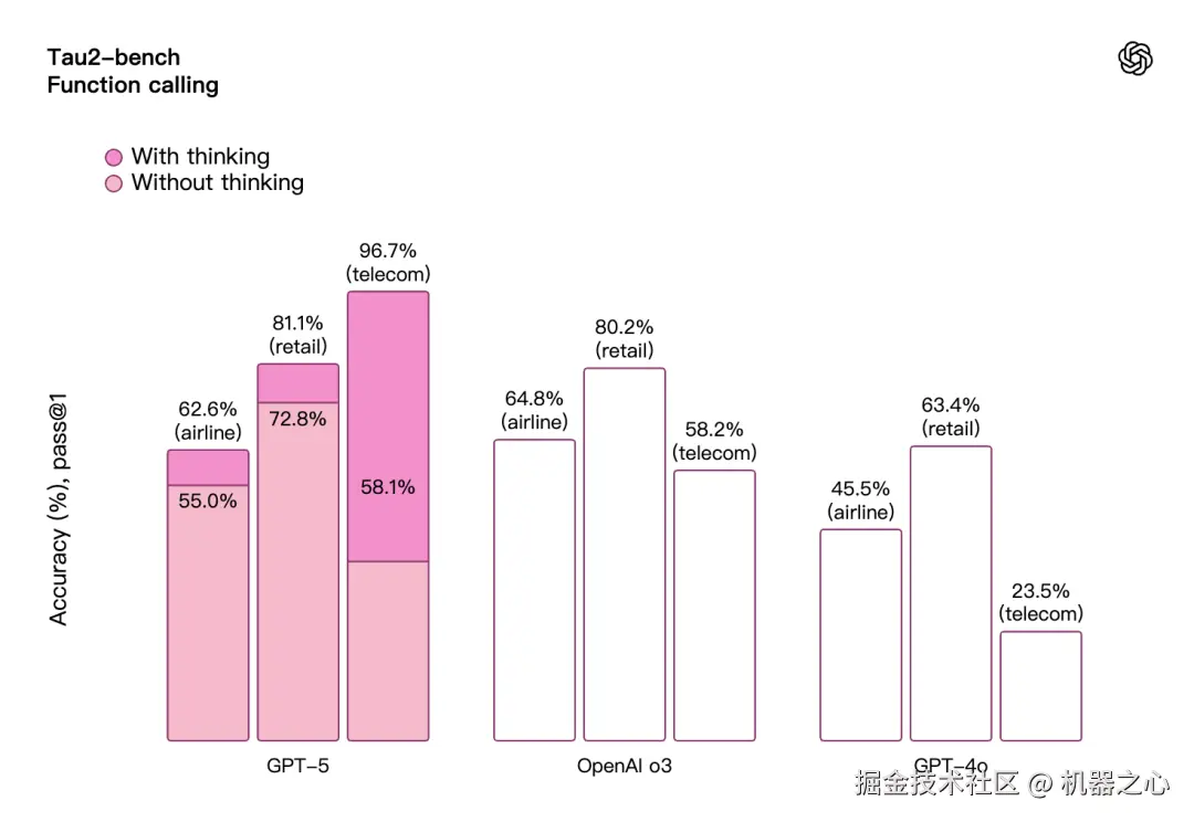 指令遵循与智能工具调用能力:GPT‑5 在指令遵循和智能工具调用基准测试中表现显著提升。这类能力使其能够可靠地执行多步骤请求、跨工具协同操作,并适应上下文变化。实际应用中,这意味着 GPT‑5 更擅长处理复杂且动态变化的任务:它能更精准地遵循用户指令,并充分利用现有工具端到端地完成更多工作环节。