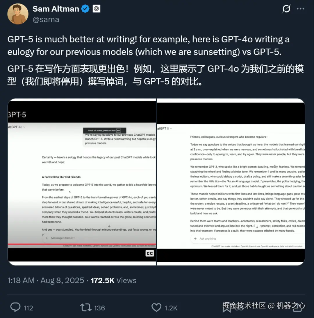 在写作方面,GPT-5 的文笔比 GPT-4o 要好。