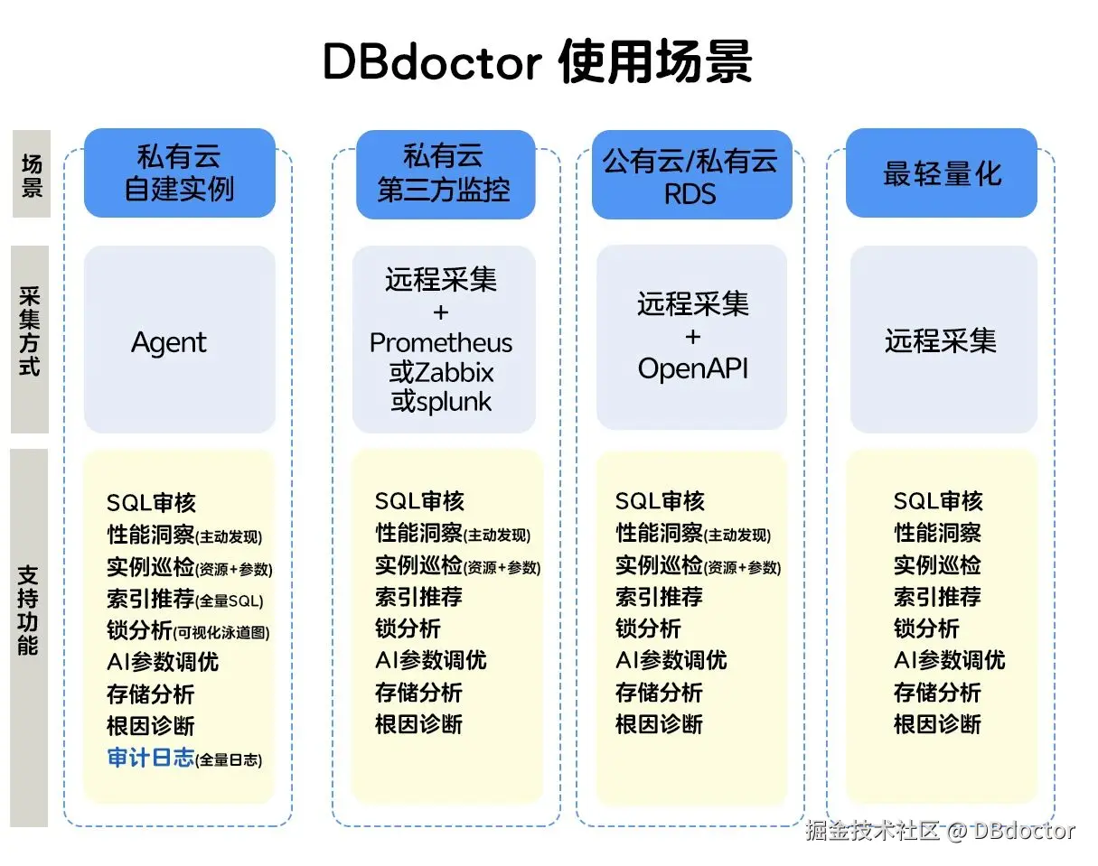 - 支持**私有云自建实例、私有云第三方监控、 公有云/私有云RDS、**最轻量化****等部署场景,采集方式及支持功能详见下图。