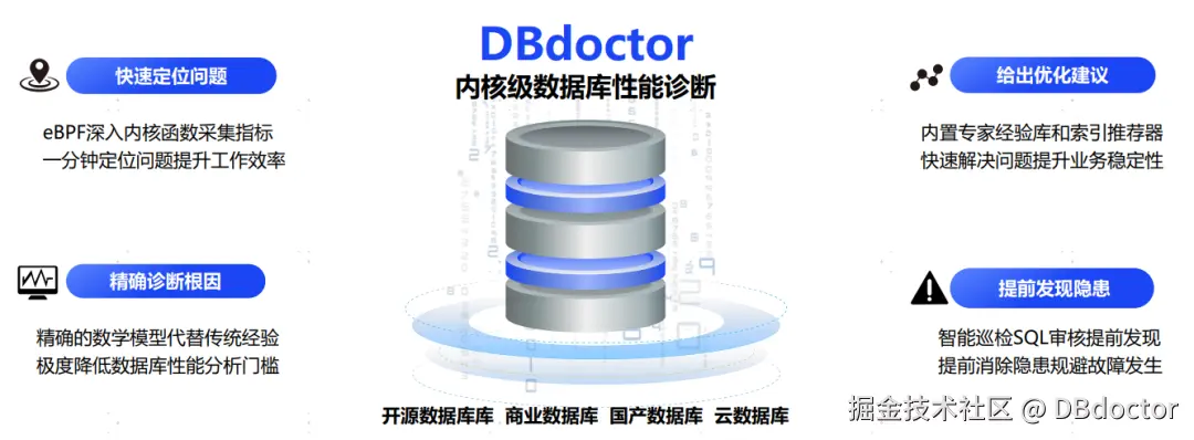 DBdoctor是一款企业级数据库SQL审核、性能诊断与优化平台。可以对数据库做细粒度的扫描,帮助您一分钟内找到数据库性能问题,实现性能诊断百倍提效。针对数据库性能诊断门槛高、耗时长的问题,DBdoctor提供了快速易用的解决方案,深入到数据库内核,实时海量数据分析,提供精准的诊断分析和优化建议。当前已支持包含商业、开源、国产、云等主流数据库引擎。